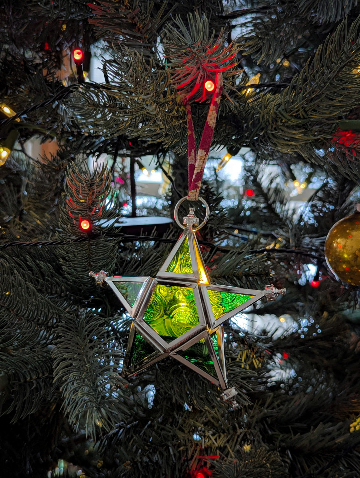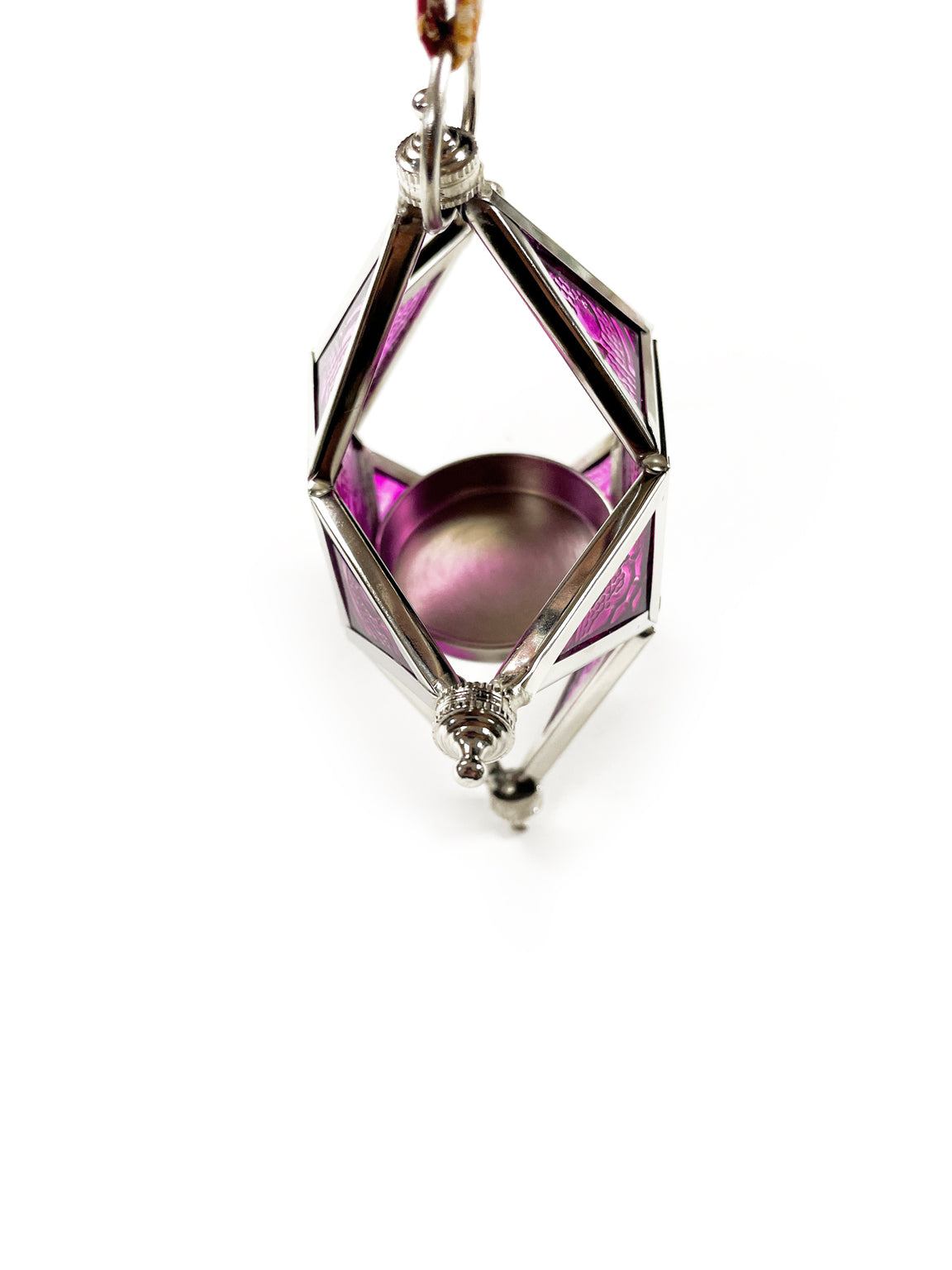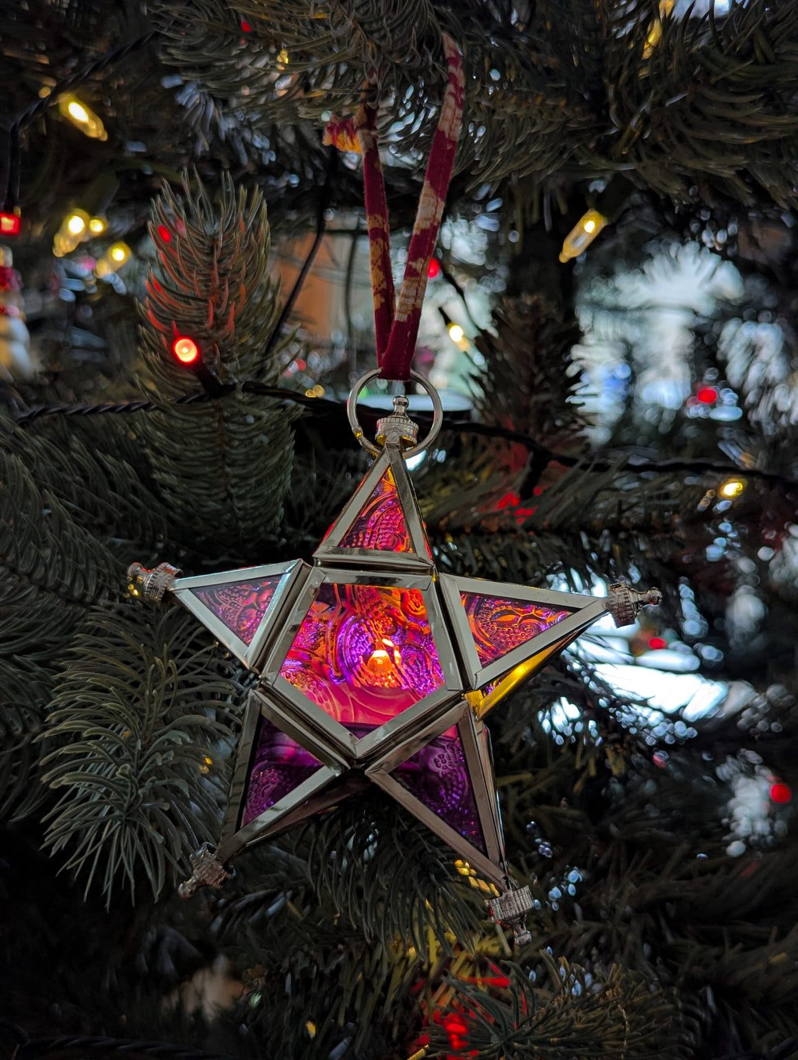 Bring warmth and character to your space with this glass star tea light ornament. Made from delicate glass and available in five lovely colors, each star hangs from a unique upcycled sari ribbon, making every piece one of a kind. When lit, it casts a gentle, cozy glow—perfect for adding charm to any room or gifting with meaning.