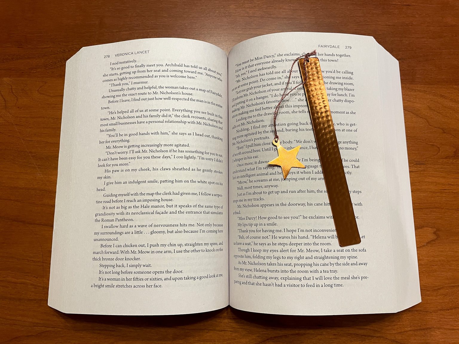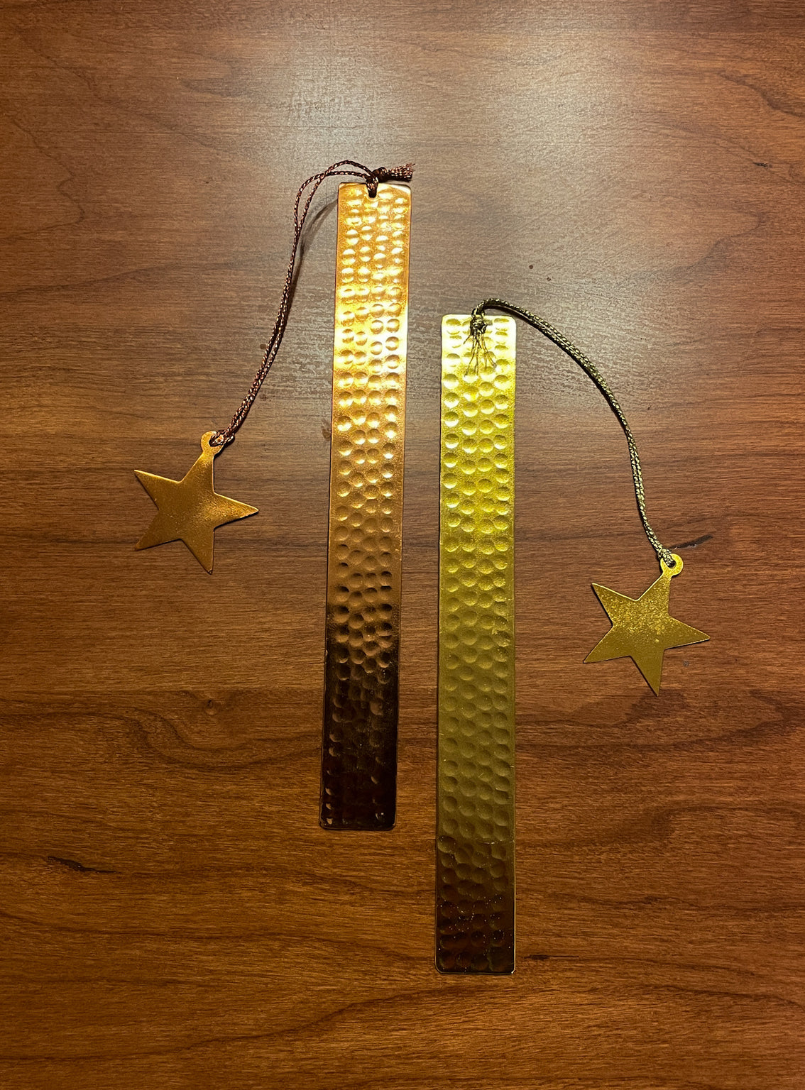 This skinny hammered metal bookmark blends simple elegance with a hint of charm. Available in warm gold and rich copper finishes, it features a textured hammered surface and a delicate small star charm that hangs from the top for a subtle, playful touch. Lightweight and stylish, it’s a lovely accent for marking your place in any book.