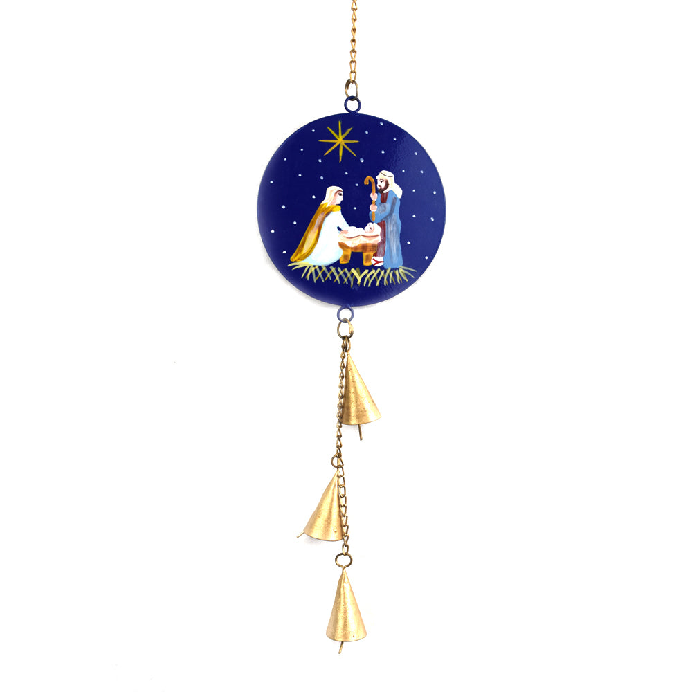 This chime is hand-painted and features a beautiful nativity scene. Enamel art is a craft form done completely by hand. Artisans use bright colors and hand paint the intricate details onto the metal. The chimes themselves are made Behat in the northern state of Uttar Pradesh, India.